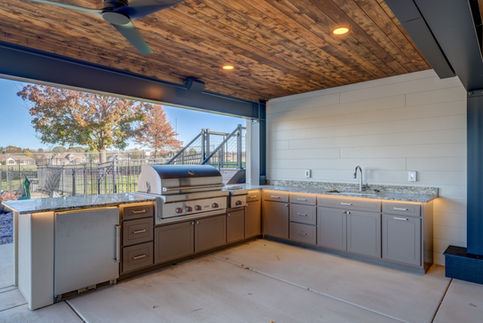 The outdoor kitchen is an entertainer’s dream, allowing guests to gather and connect while the host stays part of the action. The custom Amish-built cabinetry is crafted from durable composite plastic, ensuring it stands up beautifully to any weather conditions.