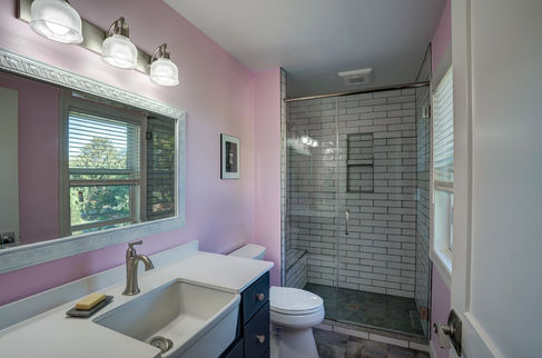 The master bathroom was updated with a new farmhouse sink, Amish painted vanity cabinet, flooring and a white granite vanity top. The subway tiled shower was increased in size by pushing the plumbing wall back, allowing space for a bench. A glass shower door allows the natural light to flow throughout. New LVT flooring, windows, trim and doors were updated on the entire main level.