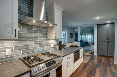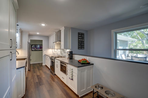 The galley kitchen was improved when the soffits and flooring were removed and replaced with a black farmhouse sink, stainless steel appliances, painted shaker style Amish cabinetry and granite countertops. The adjacent pantry with bifold doors and deep shelves was not overly operator friendly, the replacement deep pantry, with pull out shelves is far more user friendly. Glass tile backsplash completes this kitchen transformation.